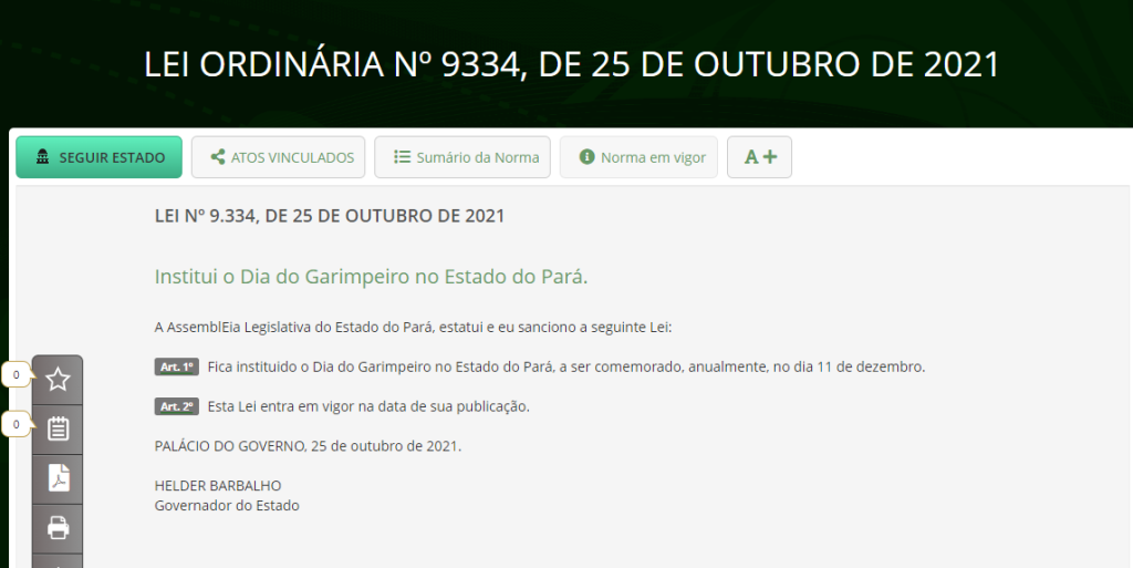 Em 25 de outubro de 2021, o governador Helder Barbalho sancionou a Lei 9.334, que institui o Dia do Garimpeiro no Estado do Pará, a ser comemorado todo dia 11 de dezembro.