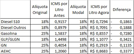 Logo, a redução da alíquota para os combustíveis sairá de 25% para 18%. A redução excetua o diesel que já está em 18%. Já o gás natural e a energia também reduzem de 25% para 18%. Para a comunicação, a queda na alíquota do ICMS é maior: de 30% para 18%.