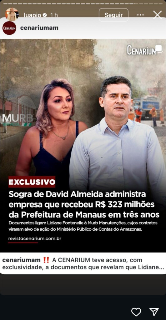 Politicamente ativa nas redes sociais, a atriz Luana Piovani publicou no perfil dela [onde acumula mais de 5 milhões de seguidores] um post sobre uma reportagem investigativa da CENARIUM, na qual foi revelada que a sogra do prefeito de Manaus, David Almeida (Avante), Lidiane Fontenelle, teve a função de “administradora” na empresa Murb Manutenção e Serviços Urbanos Ltda. A empresa recebeu mais de R$ 320 milhões do município, sob a gestão de Almeida, no período de 2022 a 2025. Leia a reportagem completa aqui. Luana também compartilhou outras publicações voltadas à política ambiental, como o debate sobre a liberação para exploração de petróleo na Foz do Rio Amazonas, e pautas sobre os povos indígenas da Amazônia.
