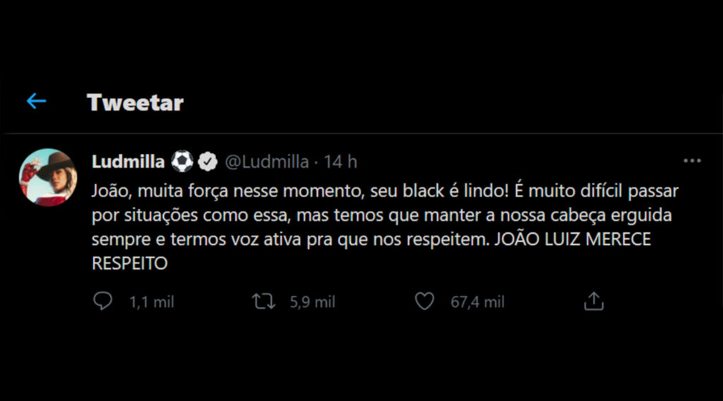 João e Camilla de Lucas, dois participantes pretos da edição do BBB21, vibraram com o comentário, que, rapidamente, fez sucesso nas redes sociais. Ludmilla, para não deixar nenhuma dúvida, foi às redes sociais comentar o fato.