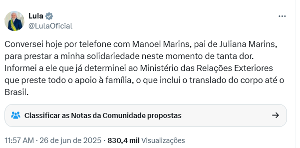 “Conversei hoje por telefone com Manoel Marins, pai de Juliana Marins, para prestar a minha solidariedade neste momento de tanta dor. Informei a ele que já determinei ao Ministério das Relações Exteriores que preste todo o apoio à família, o que inclui o translado do corpo até o Brasil”, escreveu o petista em seu perfil no X, antigo Twitter.