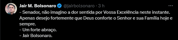 Já o ex-presidente Bolsonaro escreveu a mensagem diretamente em resposta à postagem do ex-senador Arthur Neto, e desejou força para enfrentar a perda. “Senador, não imagino a dor sentida por Vossa Excelência neste instante. Apenas desejo fortemente que Deus conforte o Senhor e sua Família hoje e sempre”, lamentou.