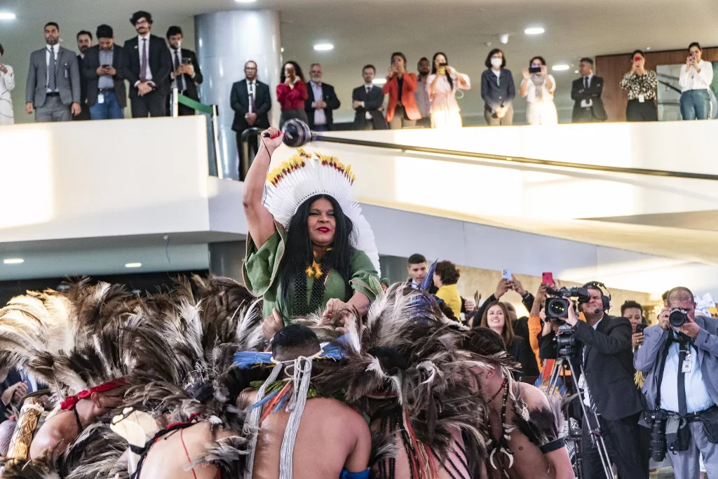 Em um evento histórico, no dia 11 de janeiro, a líder indígena Sônia Guajajara foi nomeada ministra do recém-criado Ministério dos Povos Indígenas (MPI). Para as lideranças indígenas, a nomeação foi um marco importante para o governo brasileiro, que se comprometeu durante a campanha eleitoral a criar um ministério dedicado exclusivamente às questões indígenas, visando a promover um diálogo direto e mais efetivo com essas comunidades.
