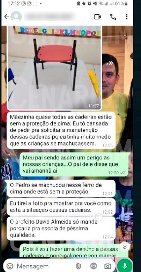 Após o acidente, Enyoellen recebeu imagens e declarações de funcionários da escola, que informaram a precariedade das cadeiras que são disponibilizadas para as crianças. Durante uma conversa registrada no WhatsApp, uma pessoa, não identificada, informou que as cadeiras estão sem a proteção do encosto e que a manutenção havia sido solicitada ao órgão responsável. O funcionário afirma na mensagem que “o prefeito David Almeida só ‘manda porcaria’ para escola e de péssima qualidade”. Veja captura de tela: