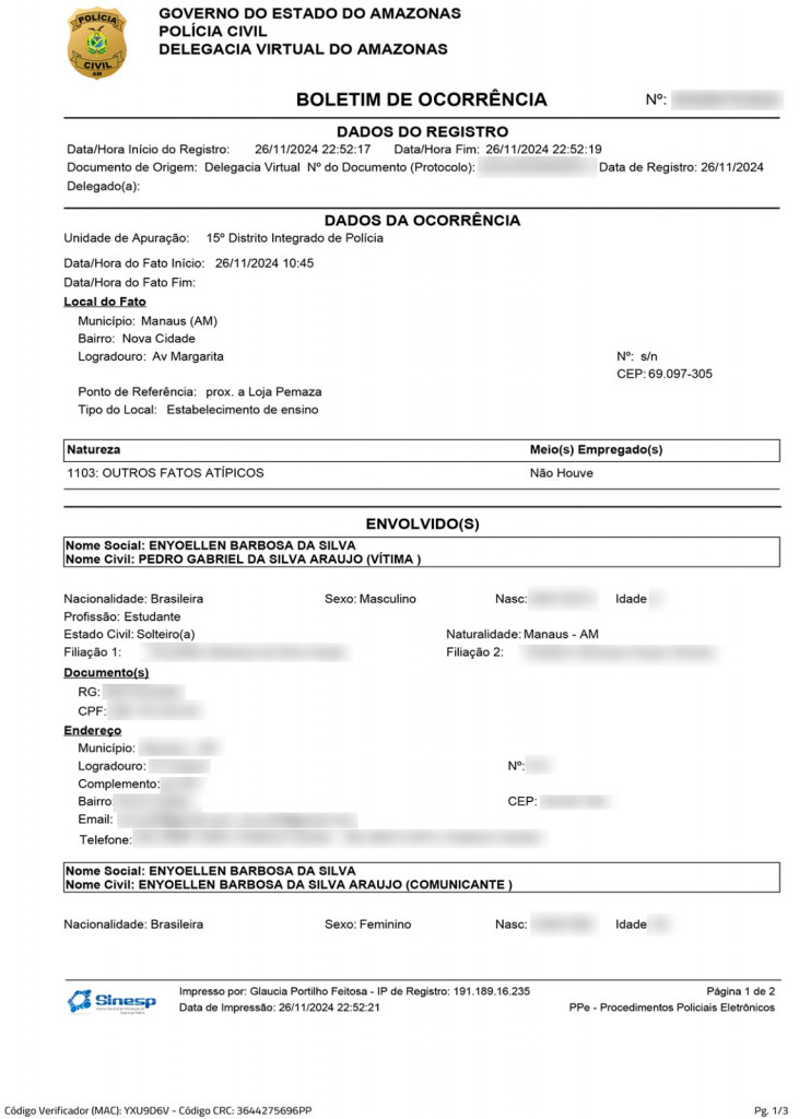 Ela também pontuou que recebeu ajuda jurídica após publicar o caso nas redes sociais. A mãe usou o Instagram para expor a situação e a revolta com a atual gestão da Prefeitura de Manaus, sob o comando de David Almeida (Avante) e com a secretária de Educação, Dulce Almeida, irmã de Almeida.