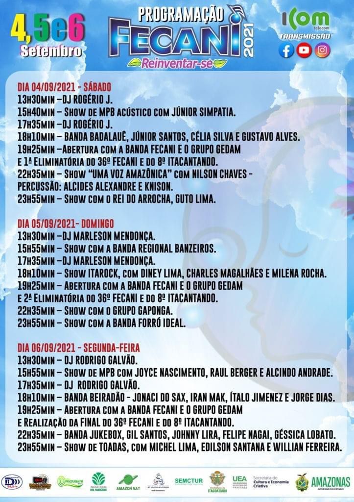 MANAUS – O 36° Festival da Canção de Itacoatiara (Fecani), considerado o maior festival de música da região Norte do Brasil, começa neste sábado, 4, e vai até a próxima segunda-feira, 6, na cidade de Itacoatiara (a 270 quilômetros de Manaus). Após ser cancelado em 2020 por conta da pandemia da Covid-19, o evento ocorre neste ano apenas com um público formado por convidados, mas será transmitido por meio de redes sociais.