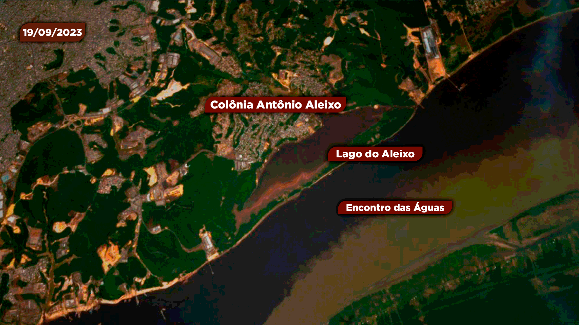 Imagens de satélite do Sentinel Hub EoBrowser, capturadas no dia 19 e 24 de setembro de 2023, mostram a mudança abrupta da paisagem. Na captura do dia 19 de setembro, é possível notar que o rio ainda ocupava todo o espaço do Lago do Aleixo, cinco dias depois, todo o perímetro já estava seco.