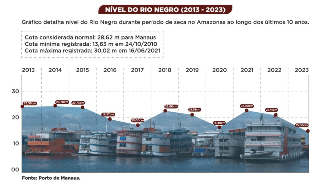 A atual medição ainda não superou a seca histórica de 2010, quando o Rio Negro chegou à cota mínima de 13,63m, registrada no dia 24 de outubro daquele ano. Apesar disso, é possível que o nível do rio reduza ainda mais, até o fim de outubro, por conta do período sazonal, e ultrapasse a medição recorde.