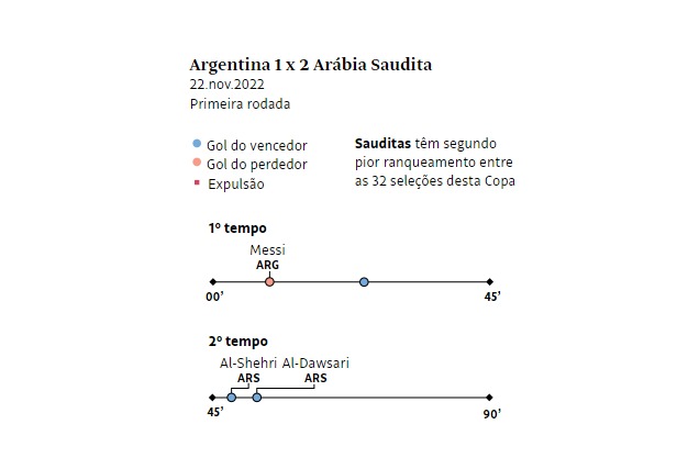 SÃO PAULO – Candidata a maior ‘zebra’ da história das Copas, a derrota da Argentina para a Arábia Saudita, por 2 a 1, na terça-feira, 22, entrou para a lista das grandes surpresas dos mundiais, de acordo com o ranking oficial da Fifa (Federação Internacional de Futebol). Mas, segundo esse critério, não é a maior delas.