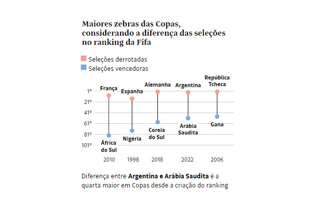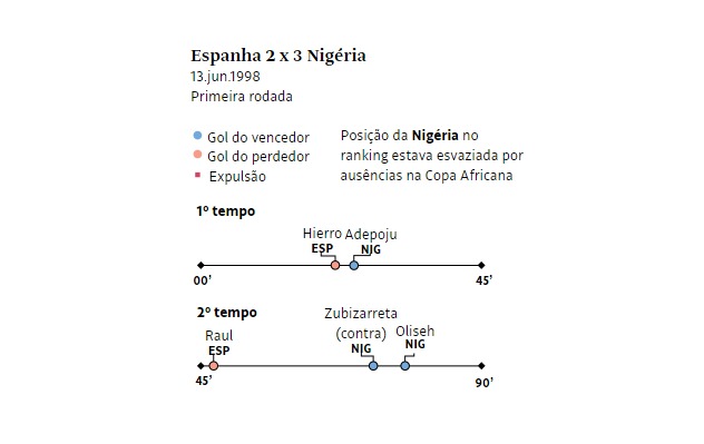 A segunda maior ‘zebra’, por esse critério, foi a derrota da Espanha (15ª) para a Nigéria (74ª) no Mundial de 1998, por 3 a 2, também na primeira fase. Naquela edição, os africanos se classificaram e os europeus fizeram as malas para casa.