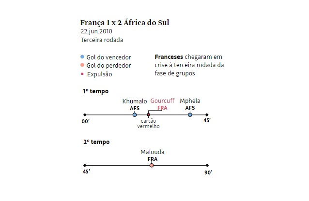 Em 2010, jogando como anfitriã, a África do Sul comemorou uma vitória surpreendente sobre a França, por 2 a 1, no encerramento da fase de grupos. O time da casa ocupava a 83ª colocação do ranking, enquanto os europeus estavam na 9ª posição. Os dois times acabaram eliminados.