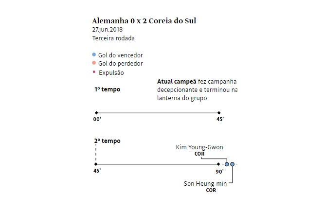 Na sequência, aparece a queda da Alemanha (1ª) diante da Coreia do Sul (57ª) na Copa de 2018. A então defensora do título mundial e líder do ranking foi derrotada pelos asiáticos por 2 a 0, com dois gols nos acréscimos do segundo tempo, pela última rodada da primeira fase. Ambas as equipes foram eliminadas, e a tetracampeã mundial terminou na lanterna do grupo.