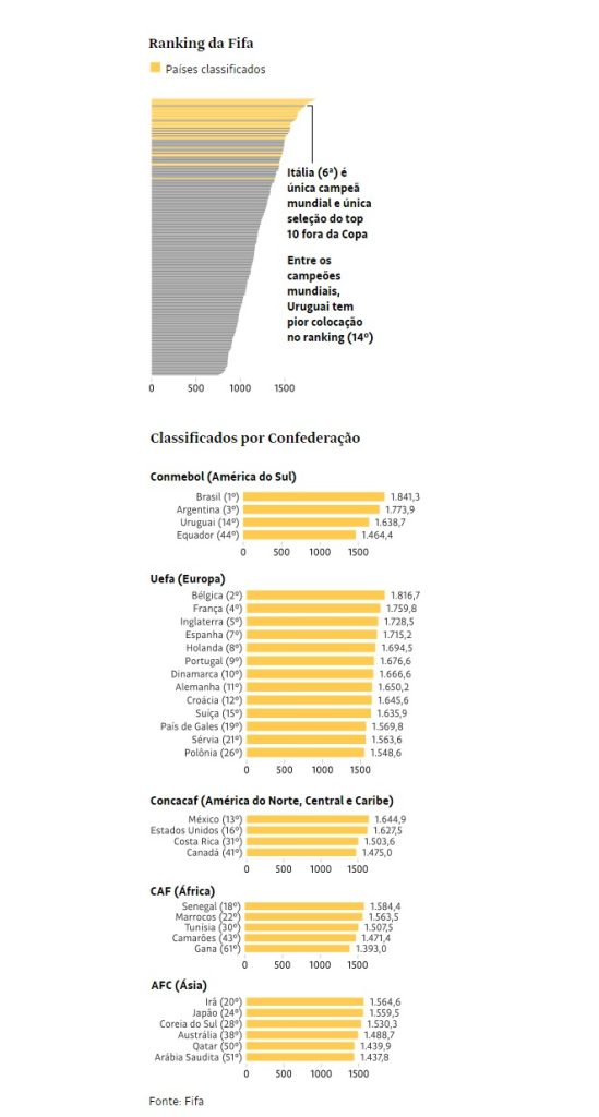 Do outro lado, a Arábia Saudita ocupa a 51ª colocação. Dentre as 32 seleções classificadas para esta edição da Copa, só está à frente de Gana (61ª) na pontuação da Fifa.