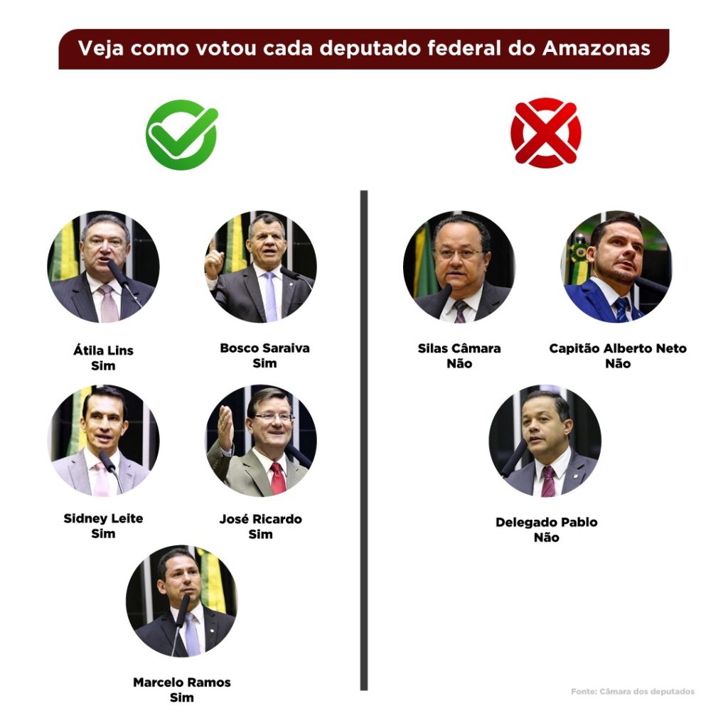 Entre os deputados do Amazonas que votaram apoiando a PEC estão: Átila Lins (PSD), Marcelo Ramos (PSD), Sidney Leite (PSD), José Ricardo (PT) e Bosco Saraiva (Solidariedade). Já os parlamentares contra a proposta são: Capitão Alberto Neto (PL), Silas Câmara (Republicanos) e Delegado Pablo (União Brasil).