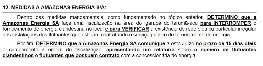 Na decisão, o juiz Moacir ordena ainda que a concessionária Amazonas Energia SA faça uma fiscalização na área do igarapé do Tarumã-Açu para interromper o fornecimento de energia clandestina no local e para verificar a existência de rede elétrica particular irregular nas instalações dos flutuantes que estejam contratando o serviço público de fornecimento de energia.