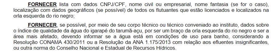 “Por meio de seu corpo técnico ou técnico conveniado ao instituto, dados sobre o índice de qualidade da água do igarapé do Tarumã-Açu, por ser um braço da orla esquerda do Rio Negro e ser a área mais afetado, devendo informar se a água está em condições de uso para banho, considerando a Resolução CONAMA 430/2011 ou a Resolução da ANA 1.175/2013 com relação aos efluentes insignificantes, ou outra norma do Conselho Nacional e Estadual de Recursos Hídricos”, define o magistrado.