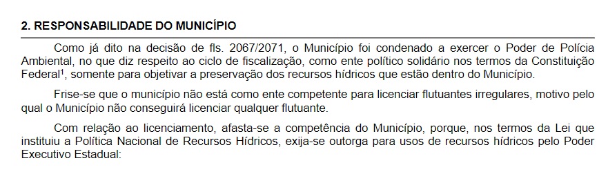 “O município [Prefeitura de Manaus] foi condenado a exercer o Poder de Polícia Ambiental, no que diz respeito ao ciclo de fiscalização, como ente político solidário nos termos da Constituição Federal, somente para objetivar a preservação dos recursos hídricos que estão dentro do Município. Frise-se que o município não está como ente competente para licenciar flutuantes irregulares, motivo pelo qual o Município não conseguirá licenciar qualquer flutuante”, afirmou o juiz.