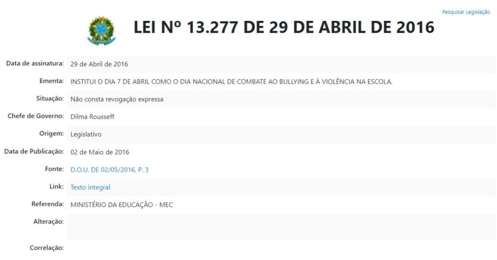 O Dia Nacional de Combate ao Bullying e à violência na escola foi instituído pela Lei 13.277, de 2016, no dia 7 de abril. A data remete ao massacre cometido em Realengo, na cidade do Rio de Janeiro. Na ocasião, um jovem de 23 anos entrou na escola e matou doze crianças (dez meninas e dois meninos).