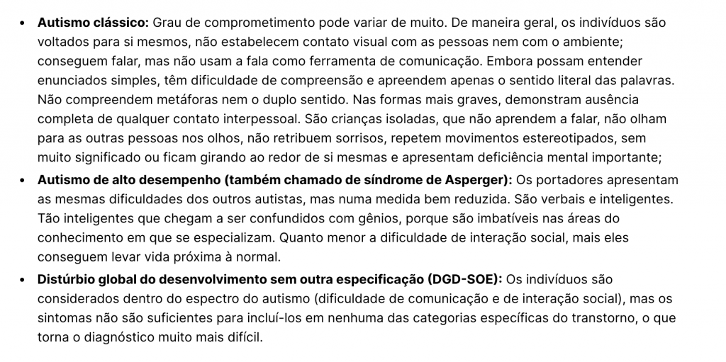 Segundo a Sociedade Brasileira de Pediatria (SBP), o Transtorno do Espectro Autista pode ser classificado em: