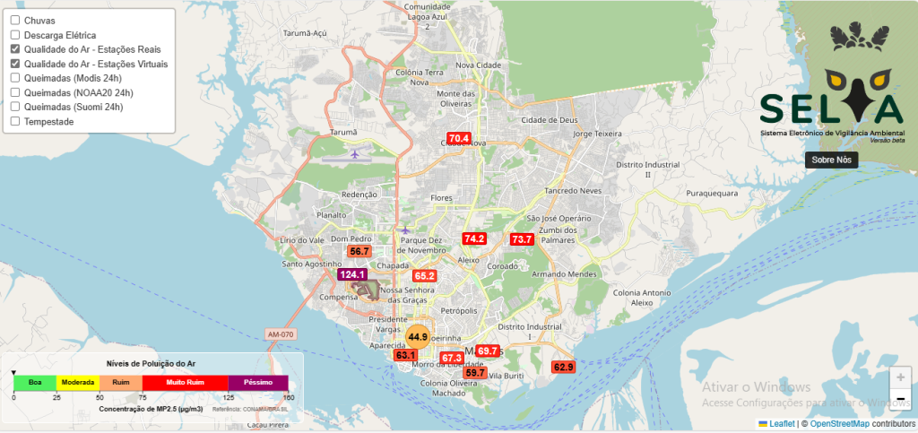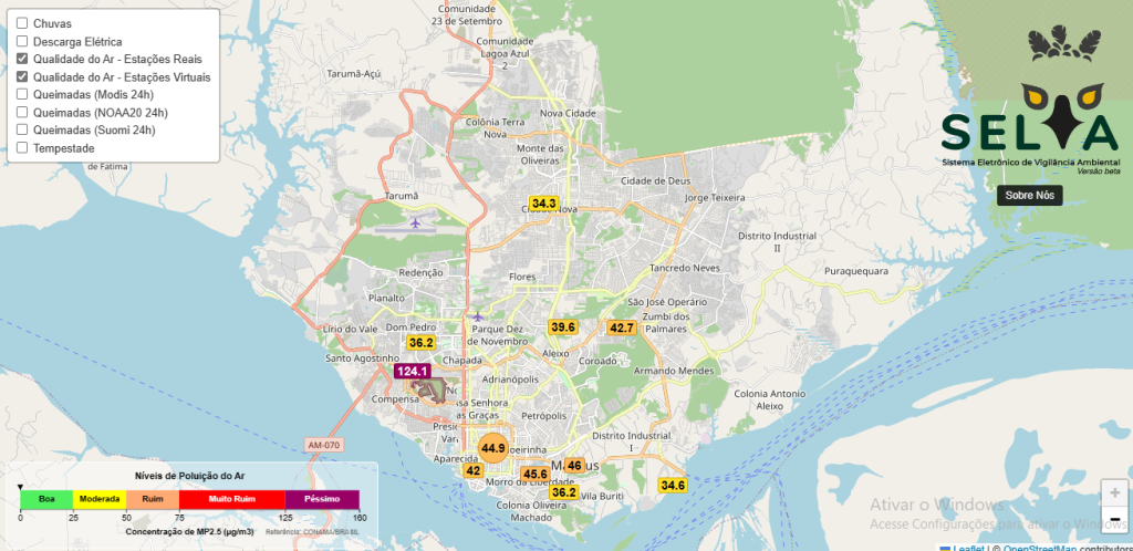 Ainda pela manhã e após a chuva, por volta de 10h30, a plataforma marcava entre 124.1 (µg/m3), na Zona Oeste, e 34.3 na Zona Norte. As médias indicavam de “ruim” a “péssima” a qualidade do ar na capital do Amazonas.