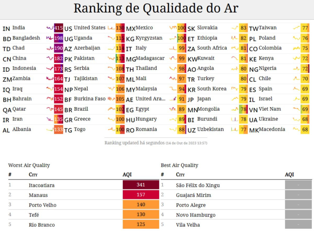 No índice por Países, o Brasil ocupa o vigésimo lugar, com AQI (sigla em inglês para Índice de Qualidade do Ar) de 102 (up/m³) na média global. Aparecem como cidades mais poluídas da federação: Itacoatiara (AM) – 341; Manaus (AM) – 157; Tefé (AM) – 140; Rio Branco (AC) – 130; Porto Velho (RO) – 125.