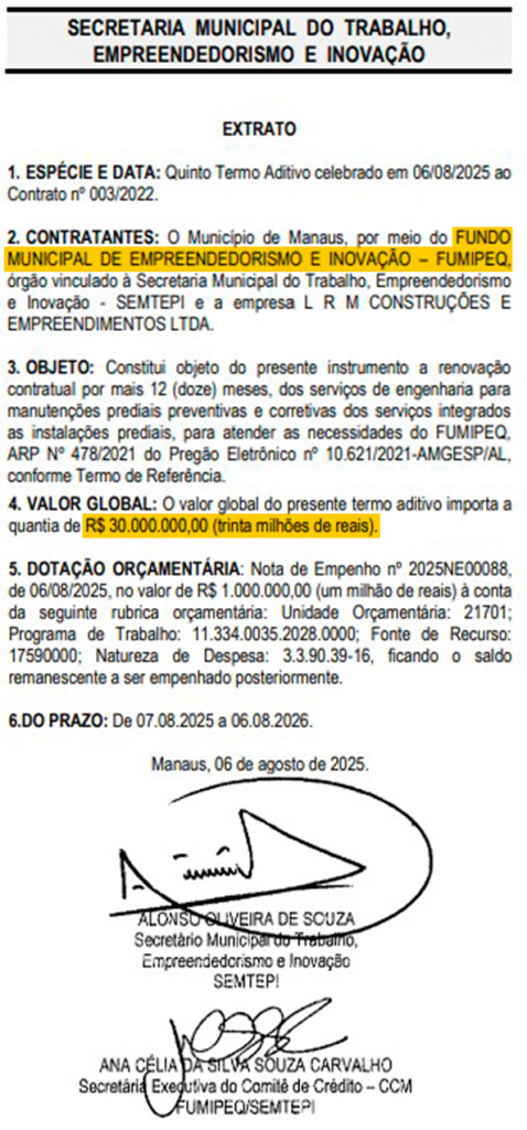 MANAUS (AM) – A Prefeitura de Manaus, sob a gestão de David Almeida (Avante), assinou, no dia 6 de agosto de 2025, um termo aditivo no valor de R$ 30 milhões para “manutenções prediais” do Fundo Municipal de Empreendedorismo e Inovação (Fumipeq). O recurso, administrado pela Secretaria Municipal do Trabalho, Empreendedorismo e Inovação (Semtepi), é voltado para apoiar ações de fortalecimento e desenvolvimento de negócios locais.