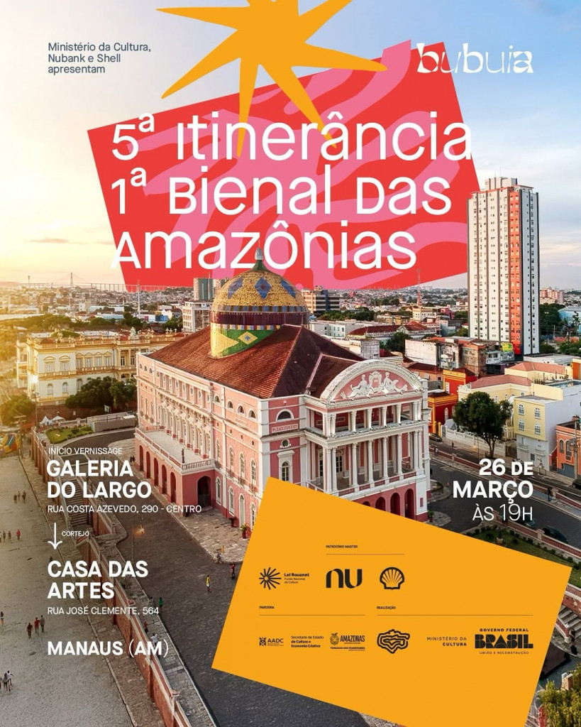 Em Manaus, a 5ª Itinerância Bubuia da 1ª Bienal das Amazônias permanece em exibição até 30 de maio, com entrada gratuita. O evento acontece de 15h às 20h na Galeria do Largo e na Casa das Artes, ambas localizadas no Largo de São Sebastião, no coração do Centro Histórico da cidade.