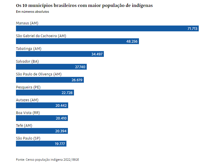 MANAUS – Batizada em homenagem a uma tribo que vivia na região, Manaus é a cidade com mais indígenas do Brasil —71.713, de acordo com os dados divulgados nesta segunda, 7, pelo Censo 2022, realizado pelo Instituto Brasileiro de Geografia e Estatística (IBGE).