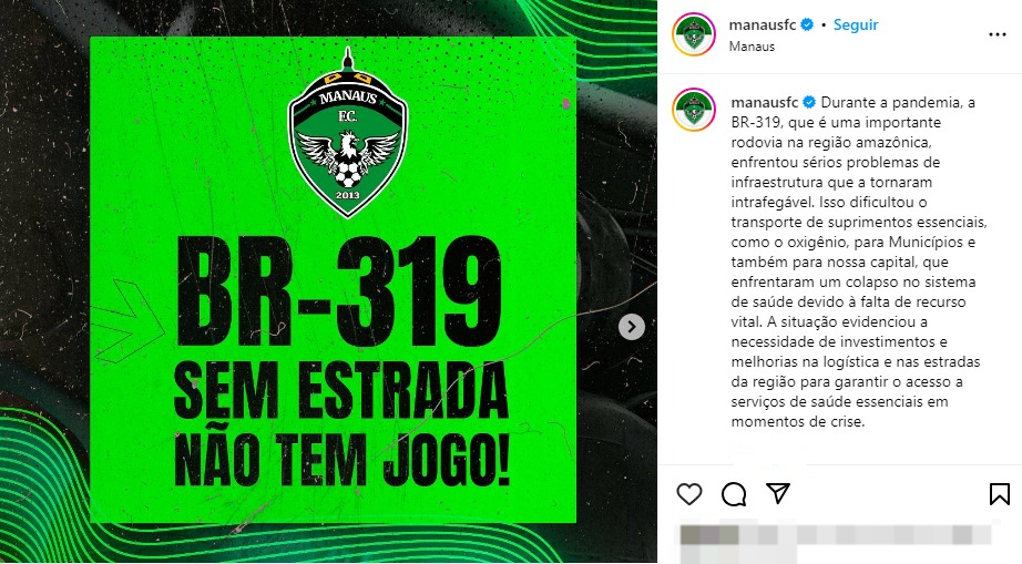 Em 2024, o time se posicionou publicamente em favor da revitalização da BR-319, que liga o Amazonas a Rondônia. A situação da estrada é uma pauta constantemente debatida na região, uma vez que sua existência coloca em risco a sobrevivência da Amazônia e de povos tradicionais que habitam a área.