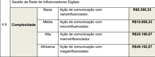 A quantia também poderá ser gasta com influenciadores digitais que varia entre R$ 5.390,33, podendo chegar até R$ 49.182,67, e deve ser estabelecido de acordo com o tamanho (em relevância no mercado) do contratado.