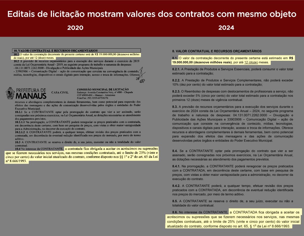 O valor de R$ 19 milhões deverá ser pago ao longo de 2024, conforme o documento. O edital detalha o projeto básico solicitado pela Semcom e estabelece que a agência receberá conforme executar e entregar o trabalho para a Prefeitura de Manaus.