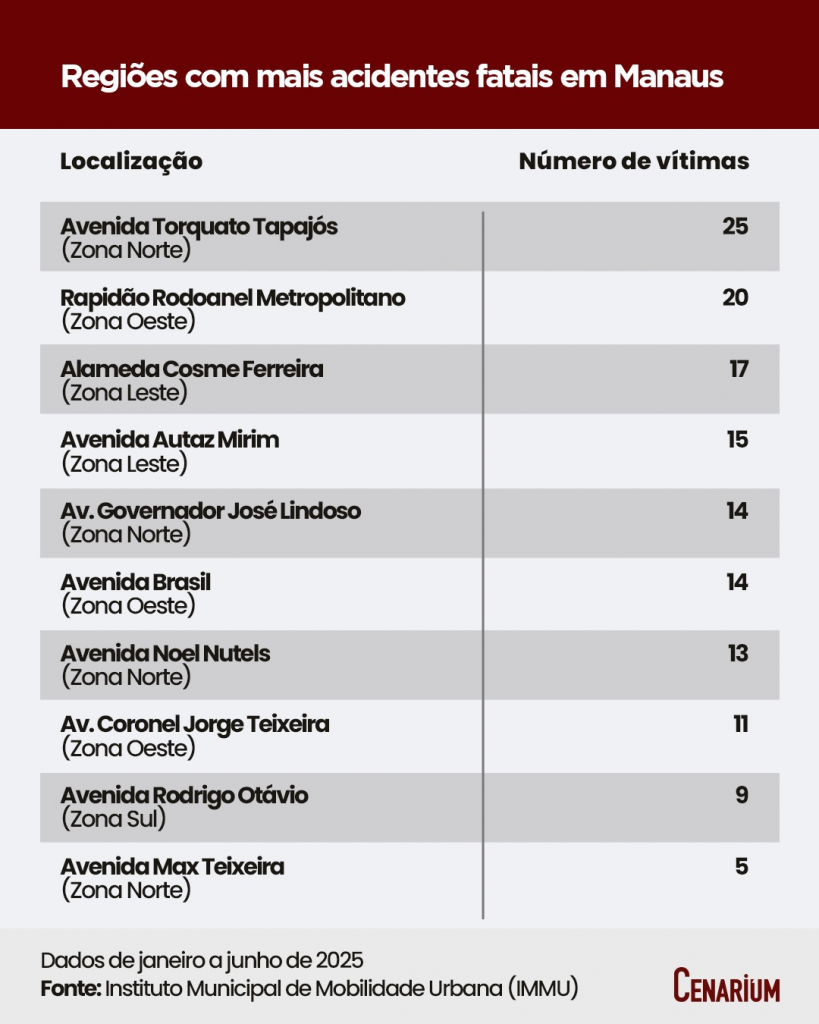Ainda de acordo com o especialista, as vias que mais registraram acidentes com vítimas fatais em Manaus foram: