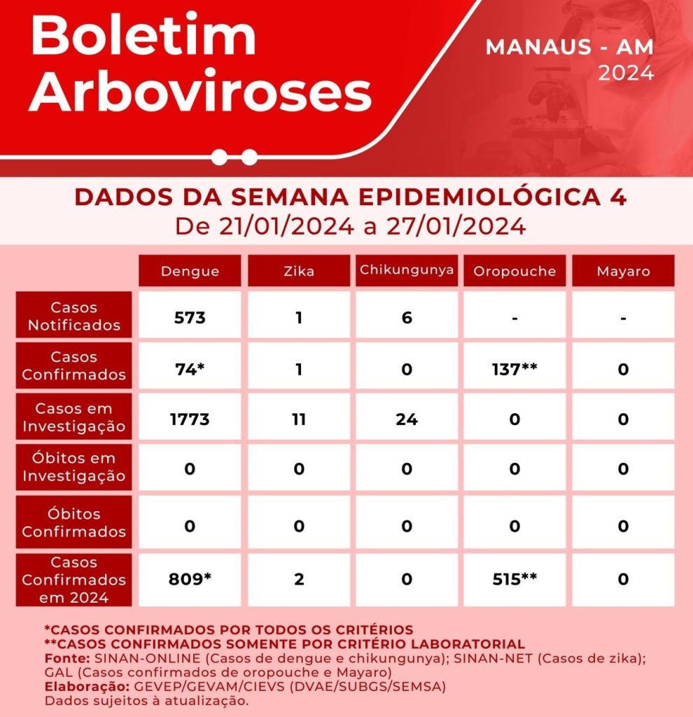 A situação em Manaus acompanha o cenário estadual e nacional de aumento nos casos de dengue. De acordo com o boletim epidemiológico divulgado pela Fundação de Vigilância em Saúde do Amazonas (FVS-AM), até o dia 25 de janeiro, o Estado registrou 3.934 casos de dengue. Nenhum óbito pela doença foi registrado, no período, no Amazonas.
