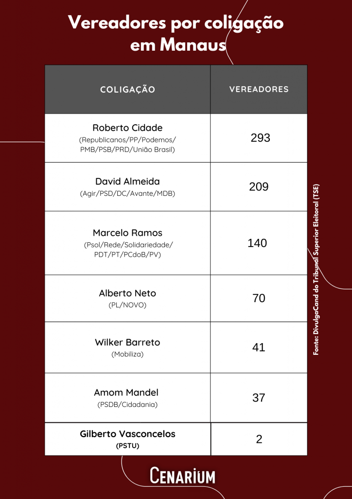 O prefeito David Almeida, que tenta a reeleição, reúne, além de seu partido, o Agir, Partido Social Democrata (PSD), Democracia Cristã (DC) e Movimento Democrático Brasileiro (MDB), posicionando-se em segundo lugar no ranking. Com 209 nomes, a aliança ocupa 25% do total de candidaturas a vereador na capital amazonense.
