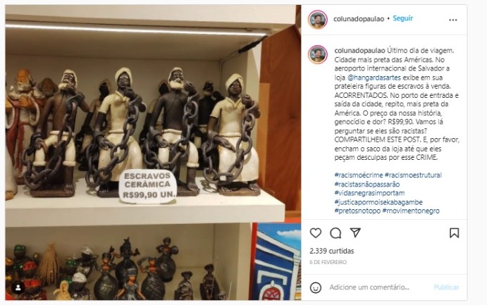 A deturpação da imagem de pessoas pretas também foi vista em outro caso emblemático envolvendo a venda de peças de cerâmicas de escravizados acorrentados na Hangard das Artes, loja que fica no aeroporto de Salvador. Vendidos como “obra de arte”, os objetos estavam na prateleira principal do estabelecimento, com a etiqueta “Escravos de cerâmica — R$ 99,90, a unidade”. Ao ver os bonecos, o estudante de história Paulo Cruz fez um desabafo nas redes.