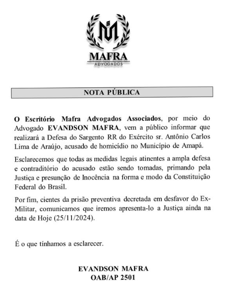 Na nota, o escritório afirma estar ciente do mandado de prisão preventiva decretado contra o ex-militar, e que ele irá se apresentar à Justiça nesta segunda-feira.