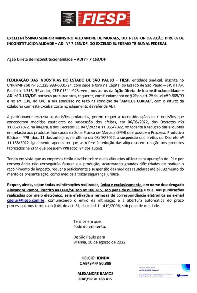 Na segunda-feira, Moraes suspendeu o decreto 11.158, editado pelo governo federal em 29 de julho, que especificou os produtos fabricados no Brasil que teriam a redução de 35% do IPI.