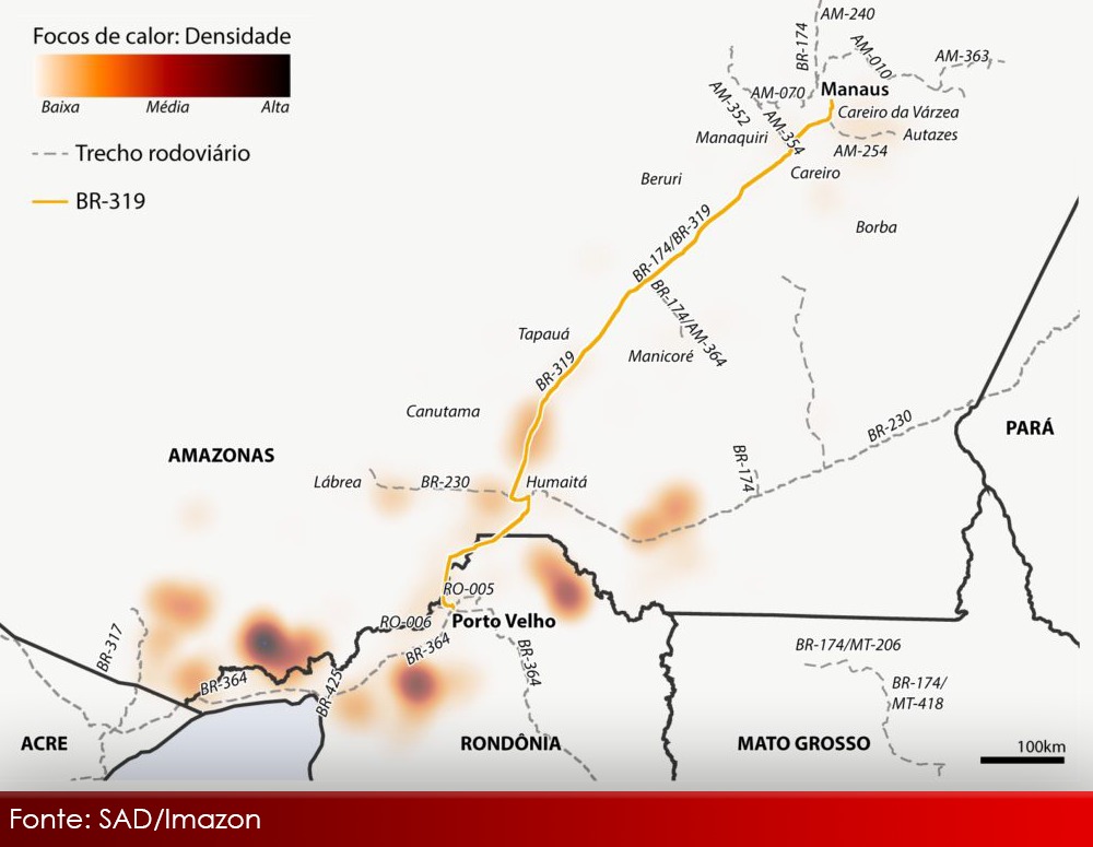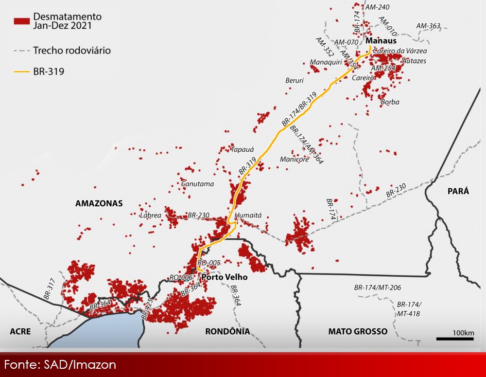 O aumento de registros de focos de calor também é um dado alarmante. Os 13 municípios impactados pela rodovia somaram mais de 10 mil focos em 2021, considerado um recorde nos últimos 12 anos e aumento de 9% em relação a 2020. Os municípios de Lábrea e Tapauá registraram os maiores focos de calor da série histórica.