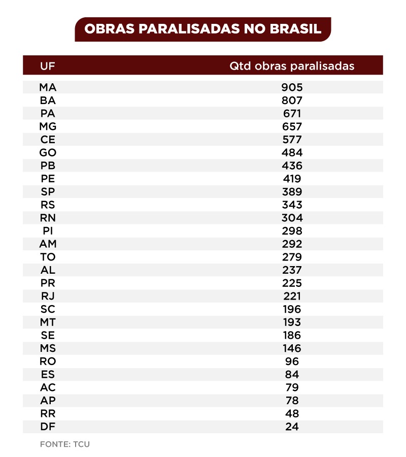 No quadro geral dos Estados, seguido do Maranhão, a Bahia ocupa o segundo lugar no ranking, com 807 obras paralisadas, e o Pará está na terceira posição (671). Na “lanterna” da lista está o Distrito Federal, com 24 obras paralisadas.