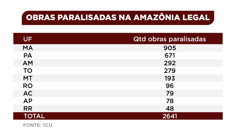Depois do Maranhão, o “campeão” em obras paralisadas é o Pará (671), seguido do Amazonas (292), Tocantins (279), Mato Grosso (193), Rondônia (96), Acre (79), Amapá (78), e por último, Roraima (48).
