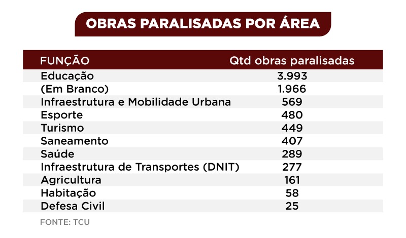 O painel do TCU ainda classificou quais áreas as obras paralisadas pertencem, indicando que “Educação“, com 3.993, é a que tem o maior número de empreendimentos com construção em suspensão. Depois, estão 1.966 obras não especificadas, indicadas pelo TCU com “em branco”. “Infraestrutura e Mobilidade Urbana” são 569. Em último está “Defesa Civil“, com 25.