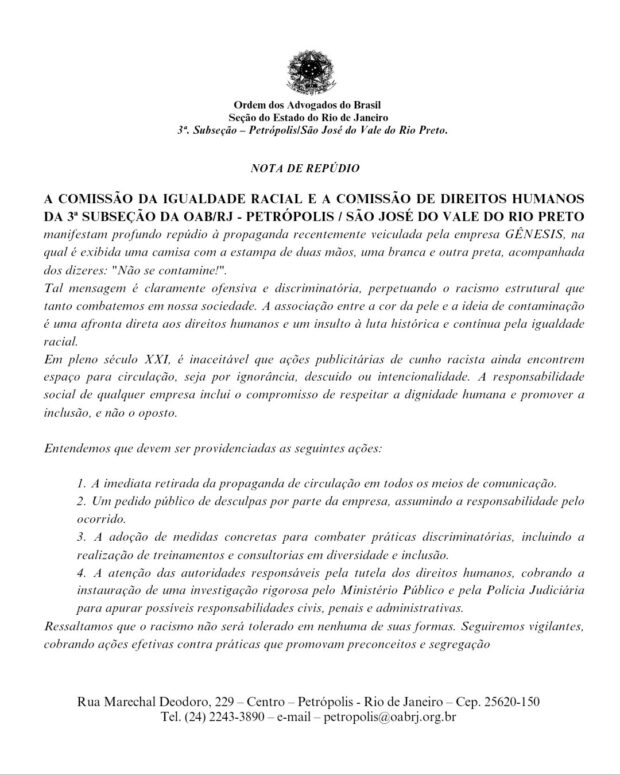 Em nota, o conselho também pediu à Polícia Civil e ao Ministério Público investigação para “apurar possíveis responsabilidades civis, penais e administrativas” dos responsáveis pelo empreendimento. Para a OAB-RJ, a mensagem estampada na camisa é “ofensiva e discriminatória, perpetuando racismo estrutural”. A associação entre a cor e a pele e a ideia de contaminação é uma afronta direta aos direitos humanos e um insulto à luta histórica e contínua pela igualdade racial, defendeu o conselho.