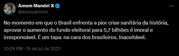 Em postagens compartilhadas em suas redes sociais em diversos anos, os dois pré-candidatos a prefeito de Manaus se pronunciaram contra o aumento e até mesmo a existência da verba. Em seu X, antigo Twitter, Amom Mandel já se referiu ao aumento do ‘Fundão’ para R$ 5,7 bilhões, valor que se encontra atualmente, como “inaceitável”, “vergonha” e “um tapa na cara dos brasileiros”.