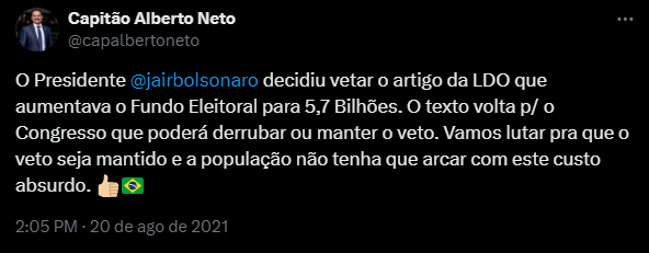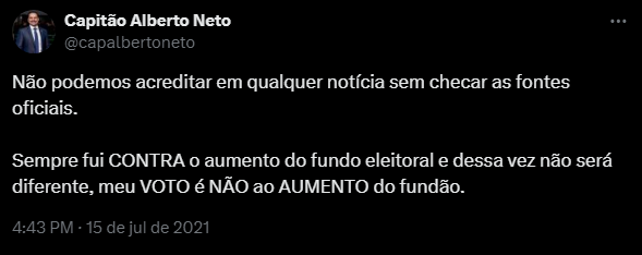 Na mesma rede, Capitão Alberto Neto também já se pronunciou sobre o assunto, reiterando ser contra o aumento do Fundo e afirmando não concordar que a população arque com esse custo.