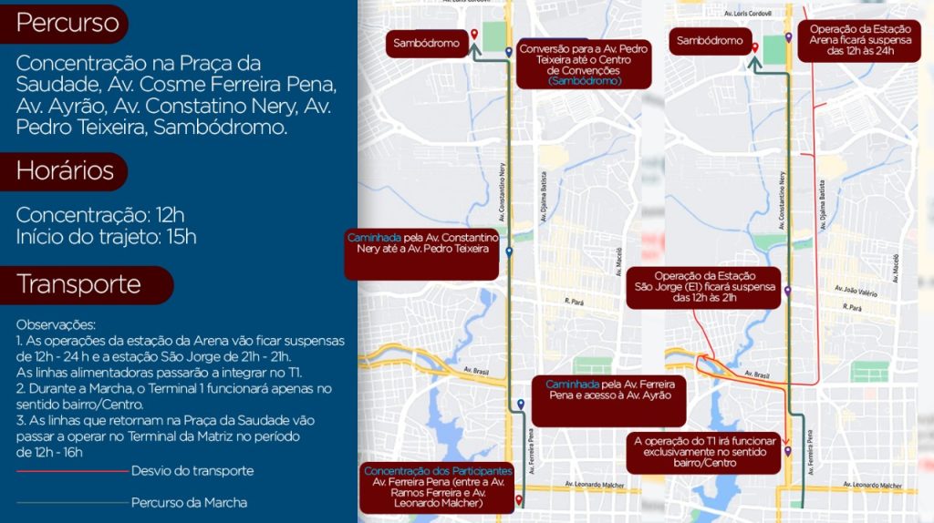 A Constantino Nery ficará interditada no sentido Centro/bairro da Avenida Álvaro Maia até o cruzamento com a Avenida Desembargador João Machado, de acordo com a passagem da marcha ou dispersão do público.