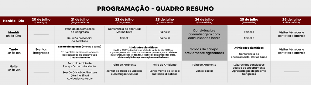 Reconhecido como o maior evento da lusofonia voltado à temática socioambiental, o congresso prevê reunir mais de 1,6 mil participantes de dez países até o dia 26 de julho. Estão previstas representações de governos, universidades, organizações da sociedade civil, movimentos sociais e comunidades tradicionais. A programação conta com atividades científicas, culturais e comunitárias distribuídas ao longo dos cinco dias.