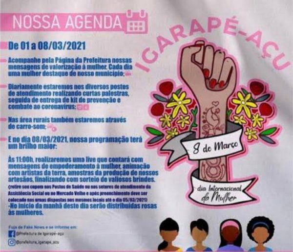 A programação do Dia das Mulheres no município começou na segunda-feira (1º) e segue até dia 8. Entre as atividades previstas, estão a oferta de exames, distribuição de kits de prevenção à Covid-19, atrações culturais e entrega de rosas às mulheres.