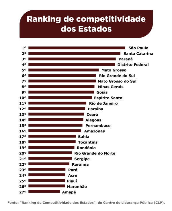 Os três últimos colocados do Ranking de Competitividade dos Estados de 2022 foram Amapá, Maranhão – ambos na Amazônia Legal –, e Piauí.