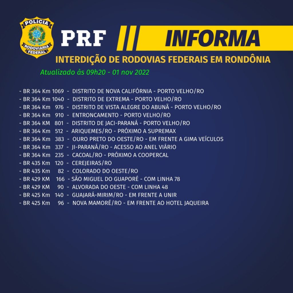 Em Rondônia, também há interdições, segundo a PRF. Eram 15 bloqueados, até a última atualização fornecida pela corporação. Foram informadas nove interdições na BR-364, duas na BR-435, duas na BR-429 e duas na BR-425.
