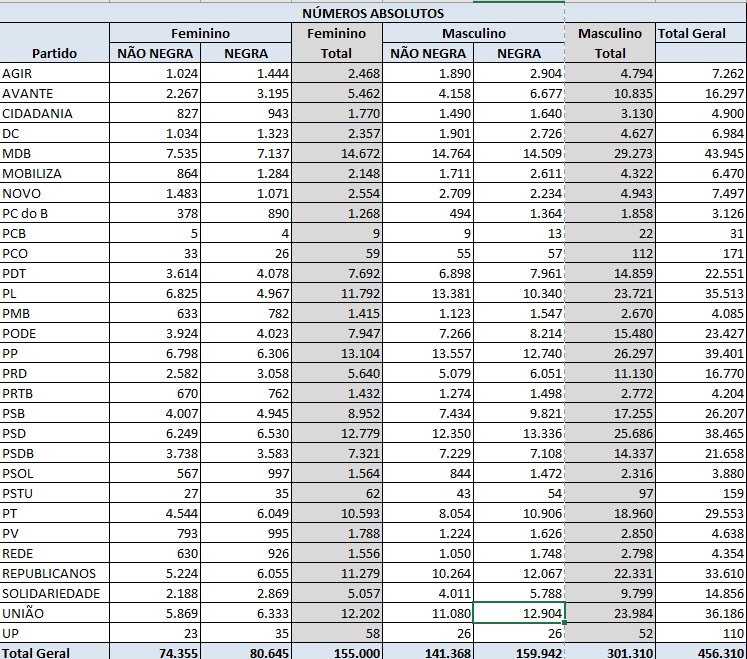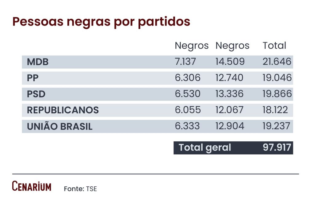 Os partidos que fazem parte do bloco do Centrão – MDB, Progressistas, PSD, Republicanos e União Brasil – são as siglas que possuem bastante candidatos negros e negras. Chama atenção esse crescimento por conta das cotas do fundo eleitoral, que são enviadas para os partidos que possuem candidatos negros e pardos. A classificação racial do TSE segue o modelo de autodeclaração do Instituto Brasileiro de Geografia e Estatística (IBGE), utilizado no Censo demográfico. O órgão considera que pessoas pretas e pardas são negras.